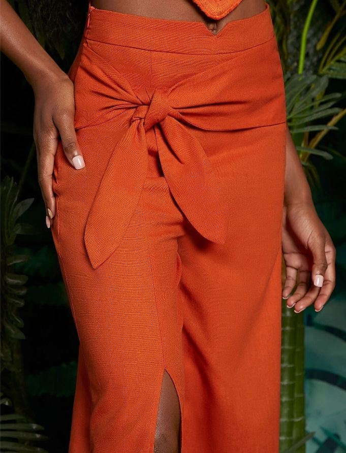 As you glide through life, these pants move with you, creating an enchanting sway. The cleverly placed high slit elongates your legs, giving the illusion of a dress. But surprise—it’s actually a flowy slack.